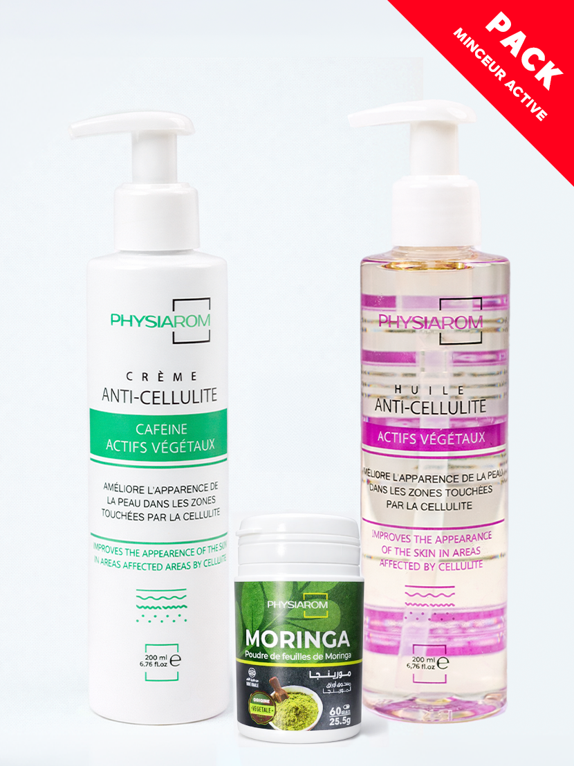 Pack Anti-Cellulite PHYSIAROM est une formule enrichie en actifs végétaux soigneusement sélectionnés pour améliorer l’apparence de la peau dans les zones touchées par la cellulite (cuisses, hanches, ventre, fesses).